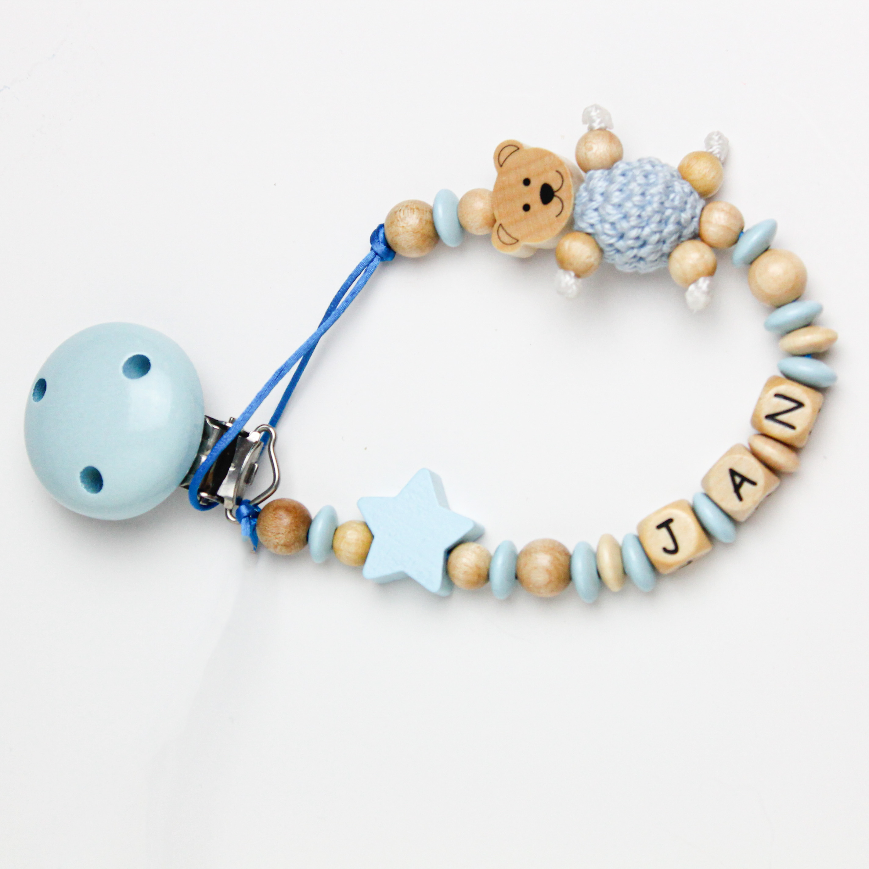 Upozornění: Všechny komponenty, ze kterých je řetízek vyroben, splňují zákonné normy DIE EN 71-3 (odpovídá ČSN 71-3). Díky tomu jsou vhodné i pro nejmenší děti. Nátěry použité k obarvení dřeva jsou potu a slinám nepropustné, stálobarevné a neobsahují žádné škodlivé látky, přesto nedoporučujeme dlouhodobý kontakt s vodou. Kovové spony k upevnění šňůrky neobsahují nikl a jsou nereznoucí. Všechny klipy jsou vybaveny ventilačními otvory zamezujícími udušení v případě vdechnutí. Přestože pevný provázek nelze přetrhnout a uzel je zataven, klip obsahuje části menší než 3×3 cm, proto nenechávejte dítě s klipem samotné. V případě porušení provázku hrozí vdechnutí korálku. Standartní klip na dudlík (dle EN) je dlouhý 22 cm (bez klipu), námi nabízený klip může být i delší. Pokud budete chtít délku upravit dle EN, napište to prosím do poznámky. Klip na dudlík není hračka a proto s ním nenechávejte své dítě bez dohledu.